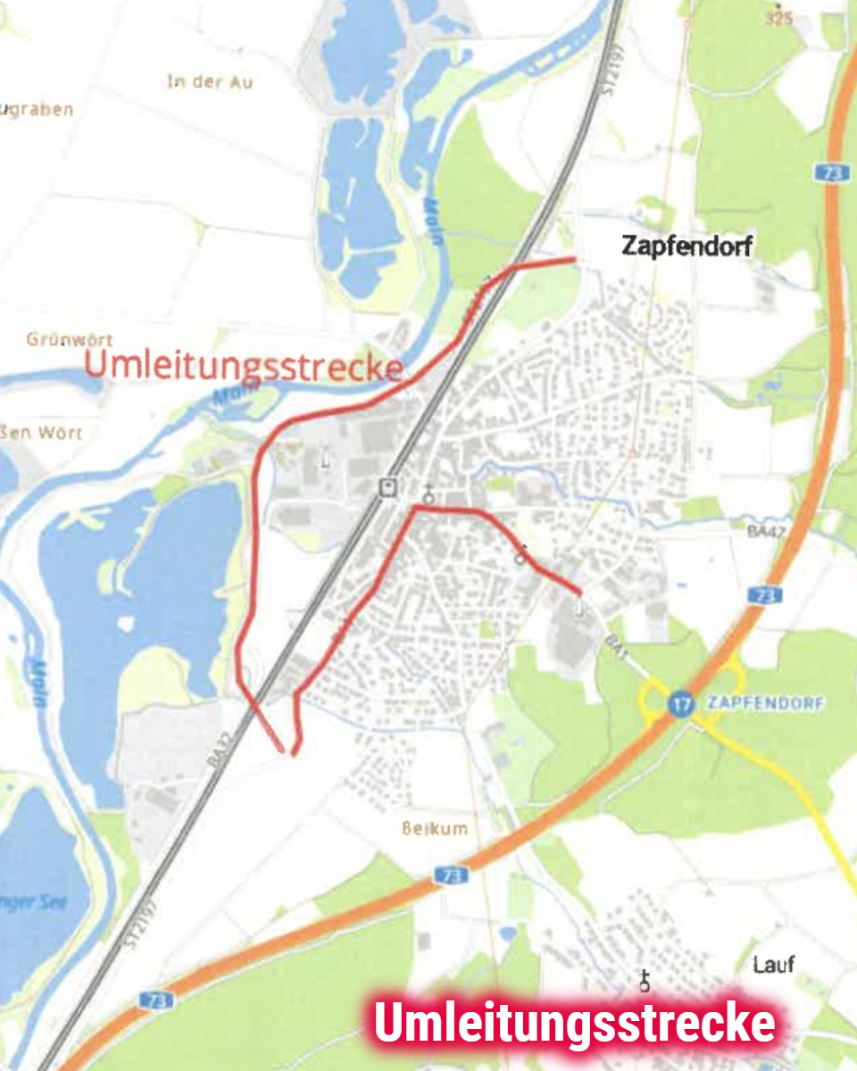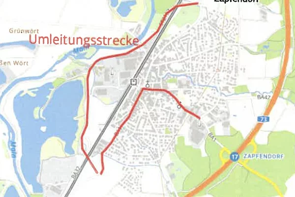 Die Umleitungsstrecke führt am Sonntag, den 12.10.2025 (ganztags) über die Westtangente Zapfendorf.