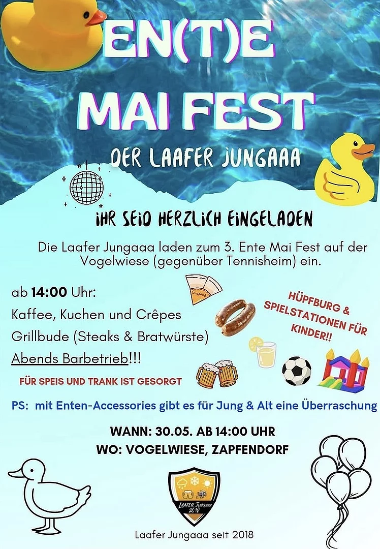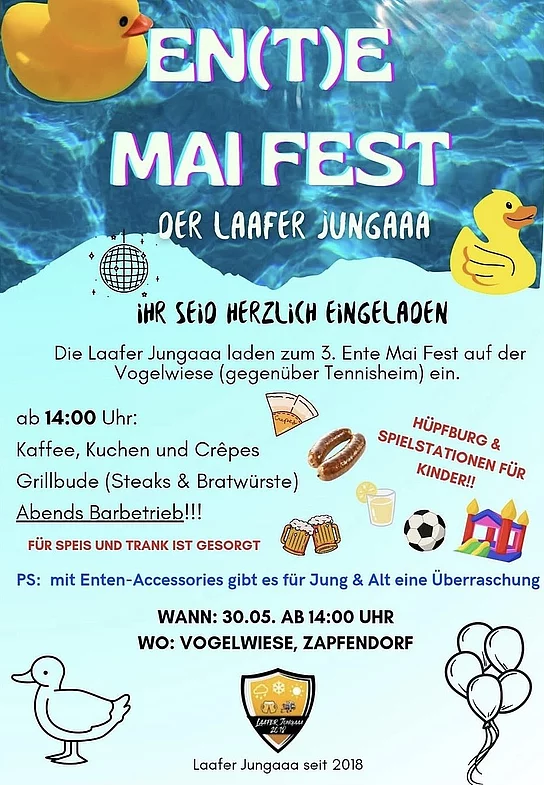 Die Laafer Jungaaa laden zum 3. Ente Mai Fest auf der Vogelwiese (gegenüber Tennisheim) ein.