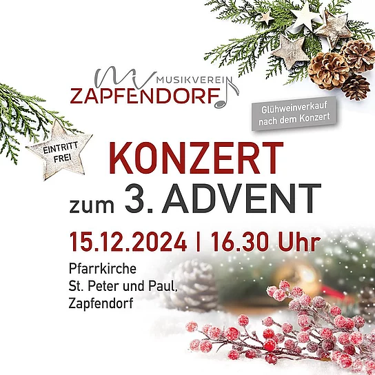 Konzert zum dritten Advent in der Pfarrkirche St. Peter und Paul. Beginn 16:30 Uhr. Der Eintritt ist frei. Glühwein und Plätzchen gibt es nach dem Konzert auf dem Kirchenvorplatz. Herzliche Einladung ergeht an alle.