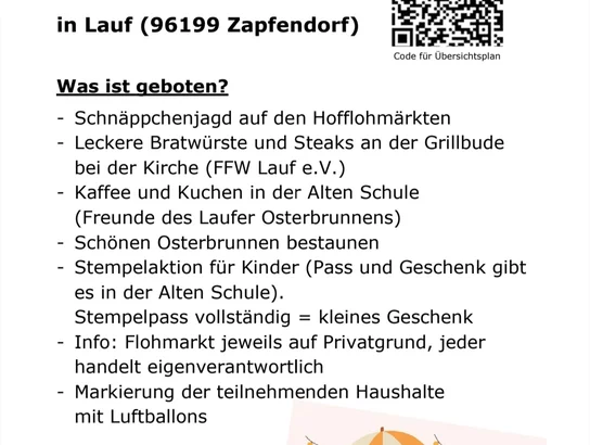 Dorfflohmarkt in Lauf, Grillbude FFW an Kirche, Kaffeenachmittag der Osterbrunnenfreunde in der Alten Schule Lauf.