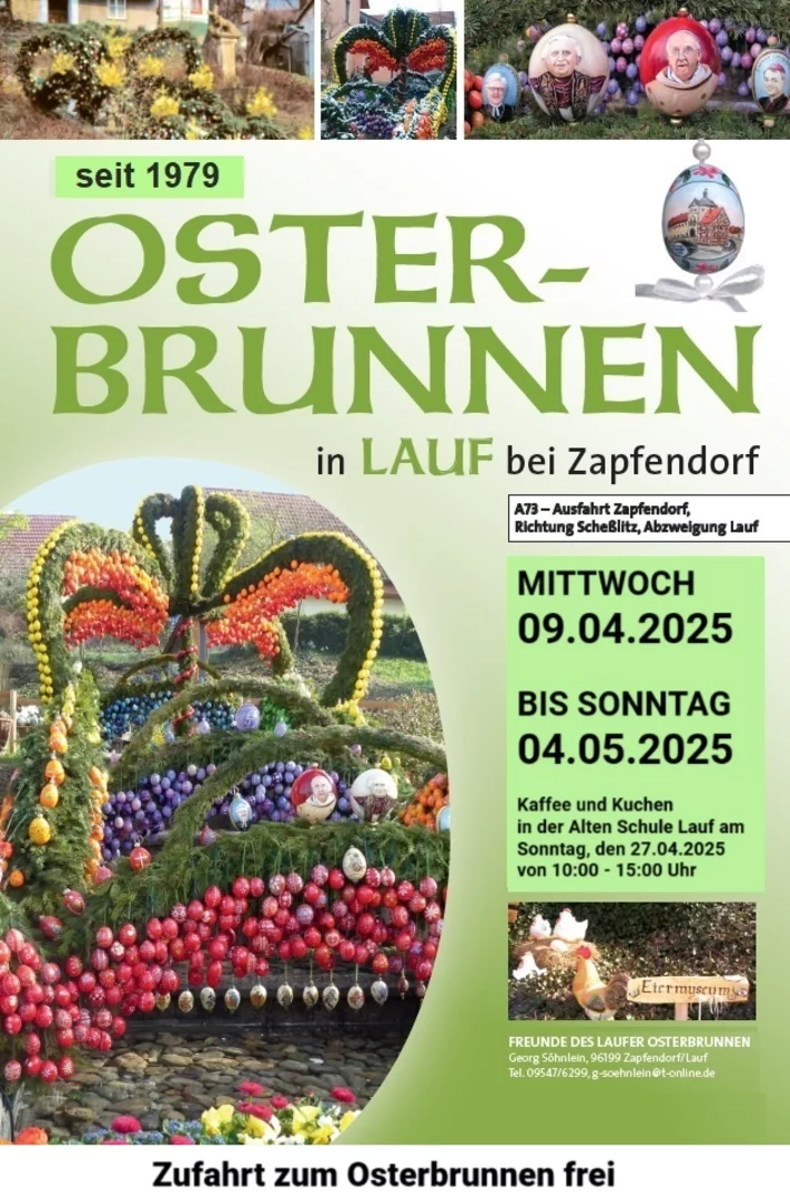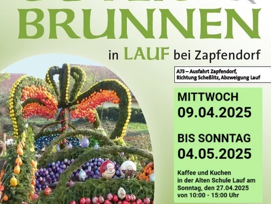Seit vielen Jahren kommen immer wieder viele Osterbrunnen-Busfahrten im Gemeindeteil Lauf vorbei, um den wunderschön geschmückten Osterbrunnen zu sehen. Aber auch die Einheimischen schauen immer wieder gerne vorbei und sind jedes Jahr aufs Neue fasziniert. Schöne Arrangements gibt es jährlich ebenso zu bestaunen wie ein Eiermuseum (sogar mit Straußeneiern).