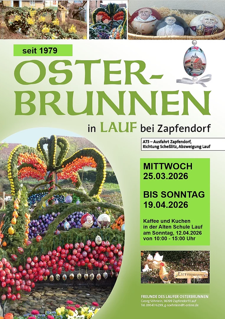 Am Sonntag, den 12. April 2026 laden die Freunde des Laufer Osterbrunnen in die Alte Schule Lauf (Kirchberg 1) ein. Dort kann man von 10:00 Uhr bis 15:00 Uhr Kaffee und Kuchen genießen - und danach bei einem kleinen Spaziergang den Osterbrunnen bewundern.