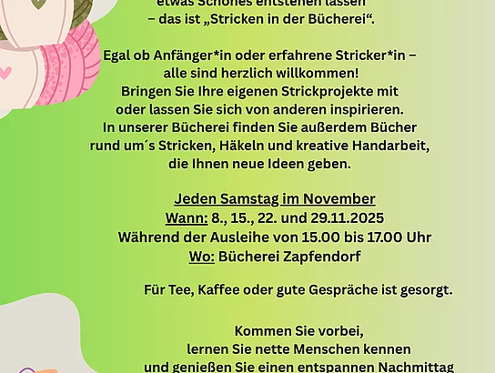 In gemütlicher Atmosphäre zusammensitzen, plaudern und dabei Masche für Masche etwas Schönes entstehen lassen - das ist “Stricken in der Bücherei”.