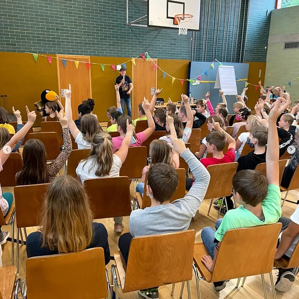 Herr Dittert las nicht nur aus seinem Buch „Die drei ??? und der Mottenmann“. Mit viel Geduld beantwortete er alle Fragen der Dritt- und Viertklässler über das Schreiben und Leben eines Autors. Zum Abschluss signierte er noch fleißig Autogrammkarten und die Kinder konnten ein spannendes Buch erwerben.