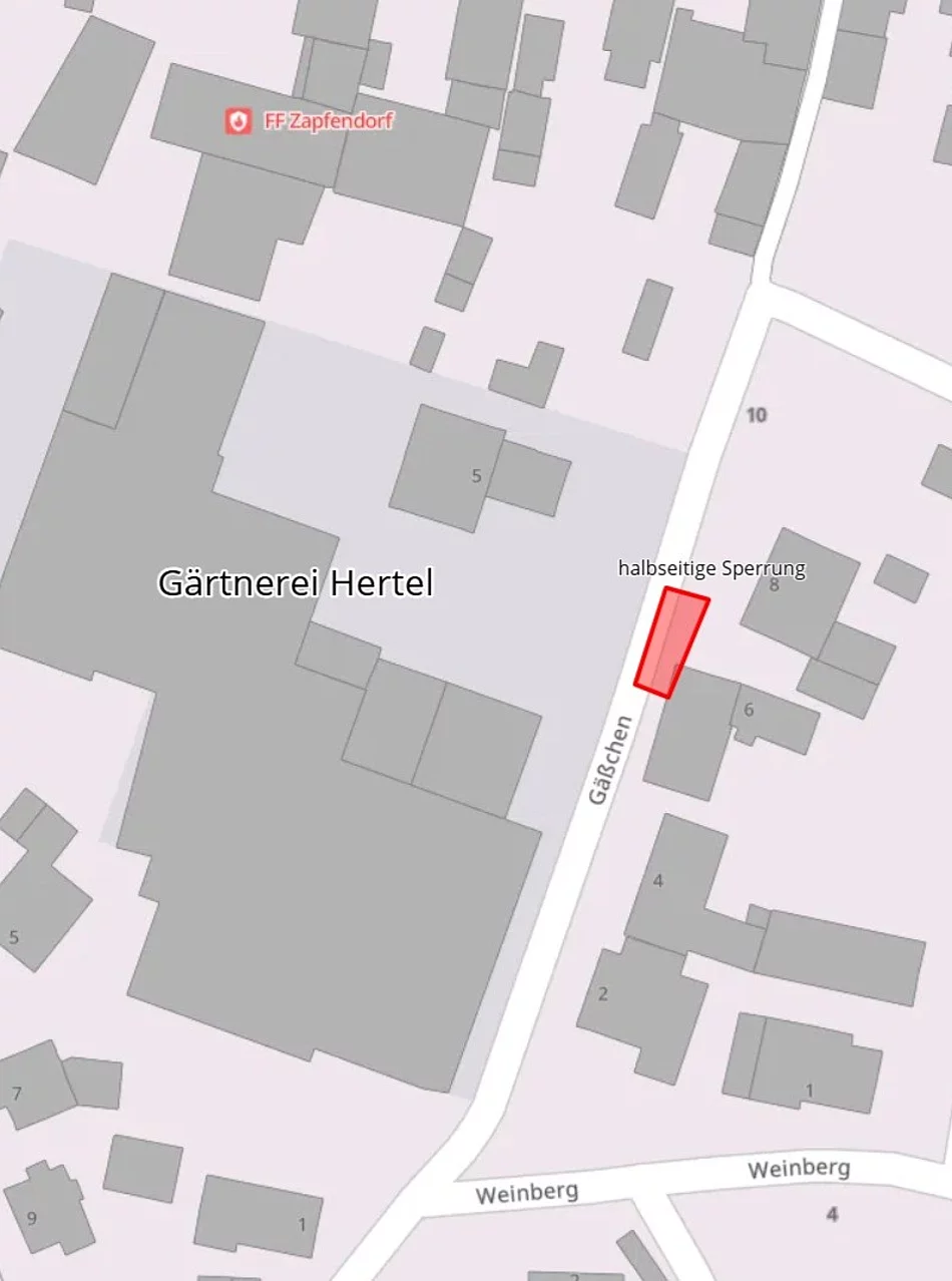 Aufgrund von Baumaßnahmen wird das “Gäßchen” (Höhe Haus-Nr. 8, Nähe Zufahrt der Gärtnerei Hertel) ab dem 18.02.2026 bis zum 20.03.2026 halbseitig gesperrt. Der Verkehr wird an der Baumaßnahme vorbei geleitet.