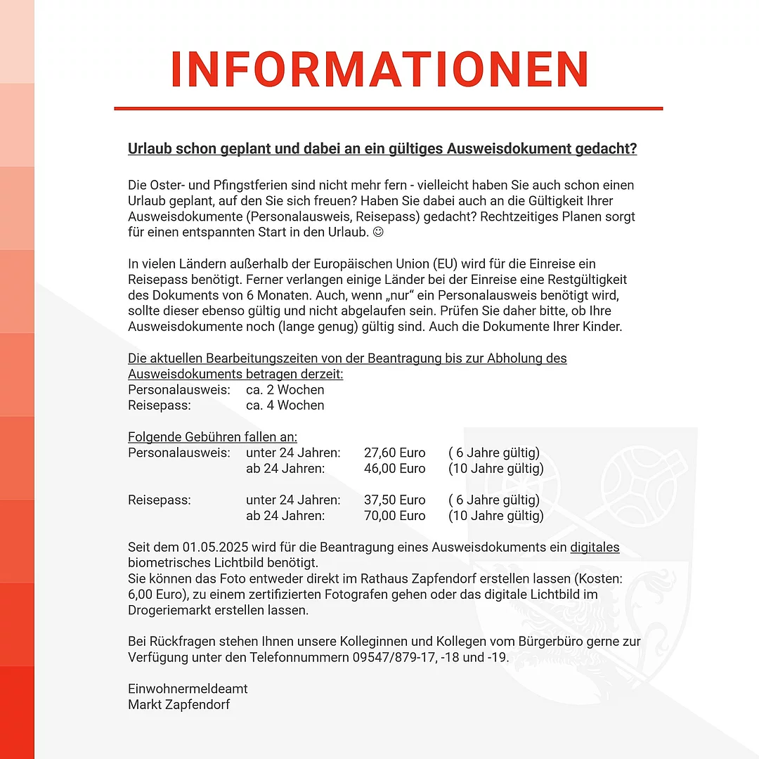 Seit dem 01.05.2025 wird für die Beantragung eines Ausweisdokuments ein digitales biometrisches Lichtbild benötigt. Sie können das Foto entweder direkt im Rathaus Zapfendorf erstellen lassen (Kosten: 6,00 Euro), zu einem zertifizierten Fotografen gehen oder das digitale Lichtbild im Drogeriemarkt erstellen lassen.
