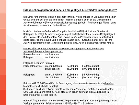 Die Oster- und Pfingstferien sind nicht mehr fern - vielleicht haben Sie auch schon einen Urlaub geplant, auf den Sie sich freuen? Haben Sie dabei auch an die Gültigkeit Ihrer Ausweisdokumente (Personalausweis, Reisepass) gedacht? Rechtzeitiges Planen sorgt für einen entspannten Start in den Urlaub. :-)