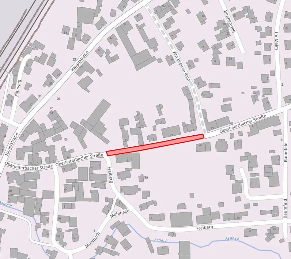 Aufgrund von Betonierarbeiten am Anwesen “Oberleiterbacher Straße 17” wird die “Oberleiterbacher Straße” im Teilbereich von der Abzweigung “Freiberg” bis zur Abzweigung “Am Breiten Rain” am 26.03.2026 für den Fahrzeug-, Fußgänger- und Fahrradverkehr vollständig gesperrt.