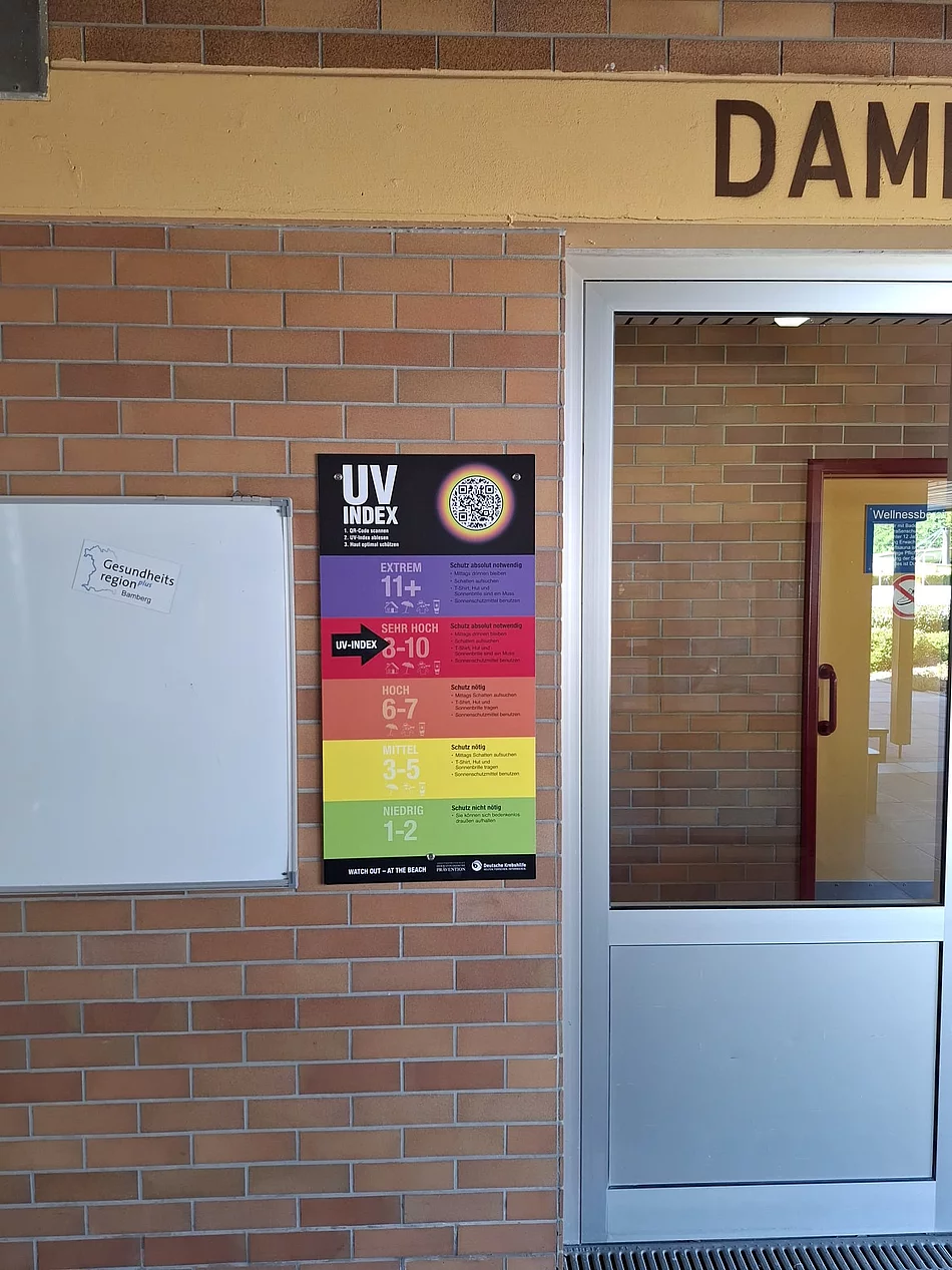 Dank dem Gesundheitsamt des Landkreis Bamberg sowie der Gesundheitsregion plus Bamberg freuen wir uns seit dieser Badesaison 2025 über eine auffällige UV-Index-Tafel, die die Besucher des AQUARENA Zapfendorf mit integriertem QR-Code darüber informiert, wie stark die Sonne scheint und welches Schutzverhalten angebracht ist.